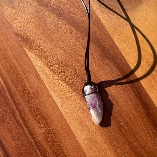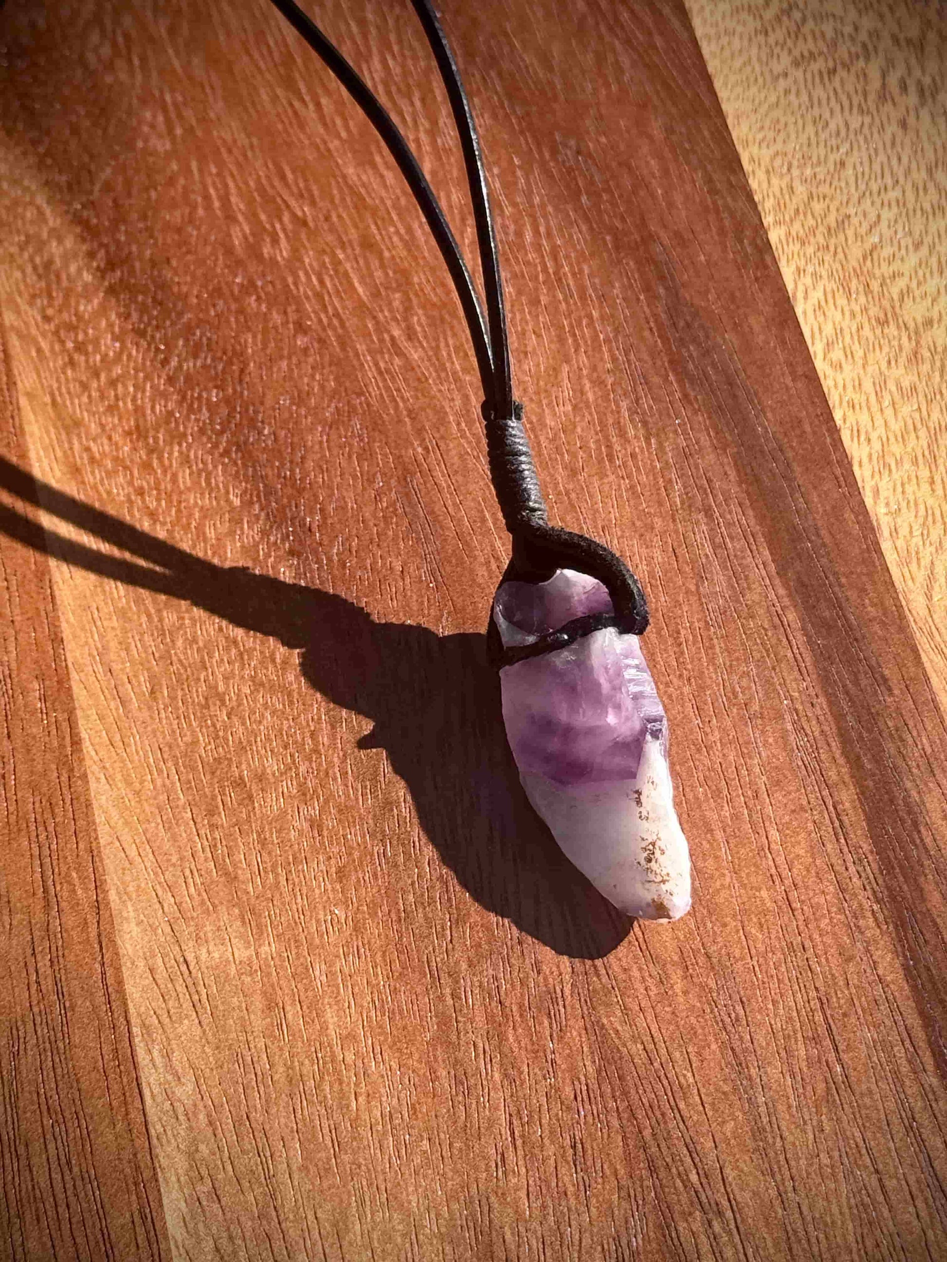 This one-of-a-kind banded amethyst necklace showcases the natural beauty of layered purple and white quartz, each band forming organically over thousands of years to create a truly unique gemstone. Hand-wrapped on an adjustable black leather cord.