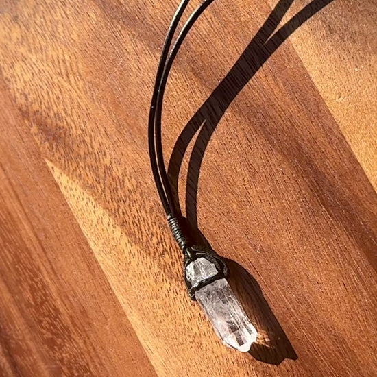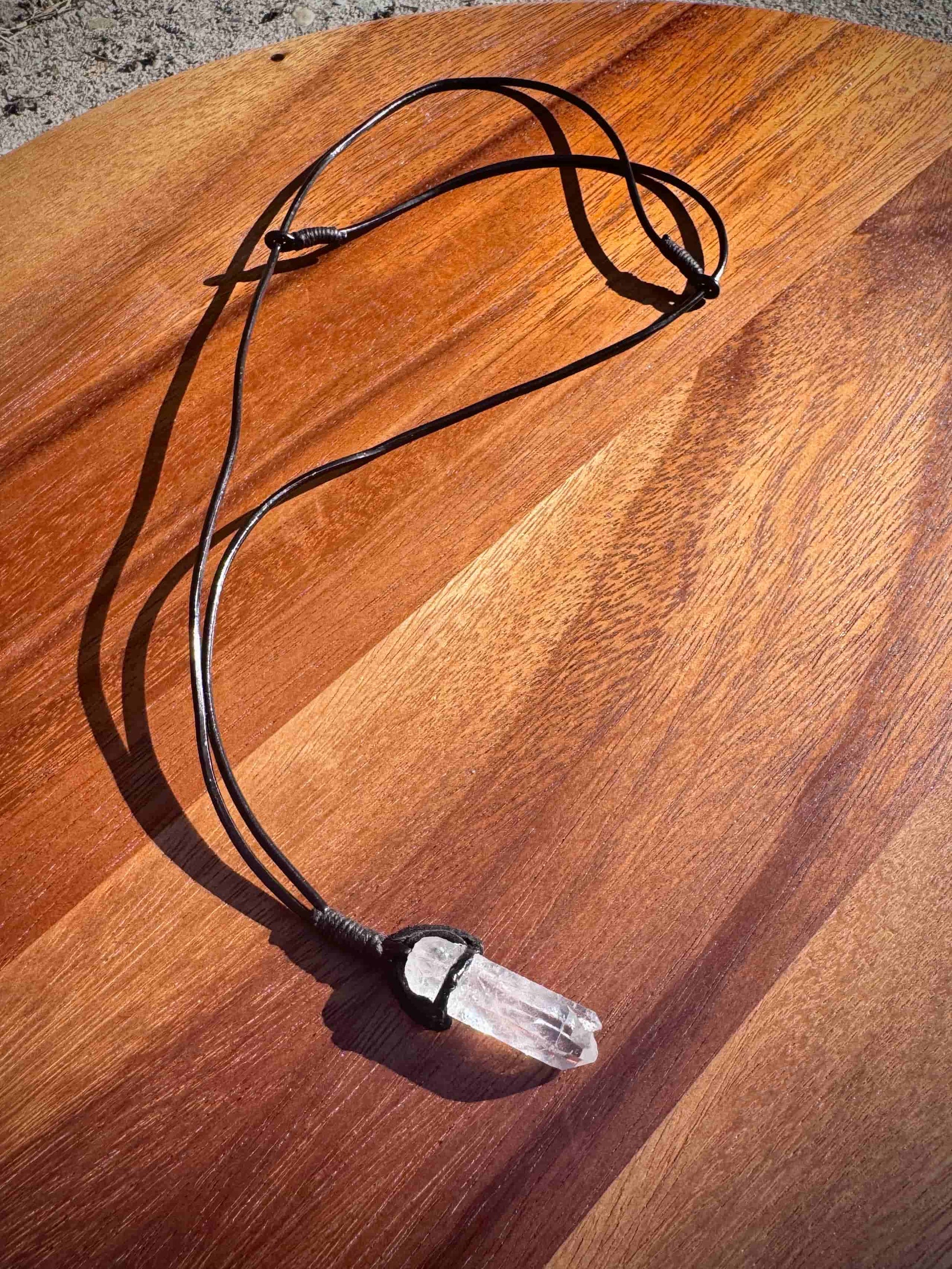 This one-of-a-kind clear quartz crystal necklace is handcrafted with care, featuring a uniquely shaped natural quartz double point wrapped in, and suspended from, an adjustable black leather cord for the perfect custom fit.