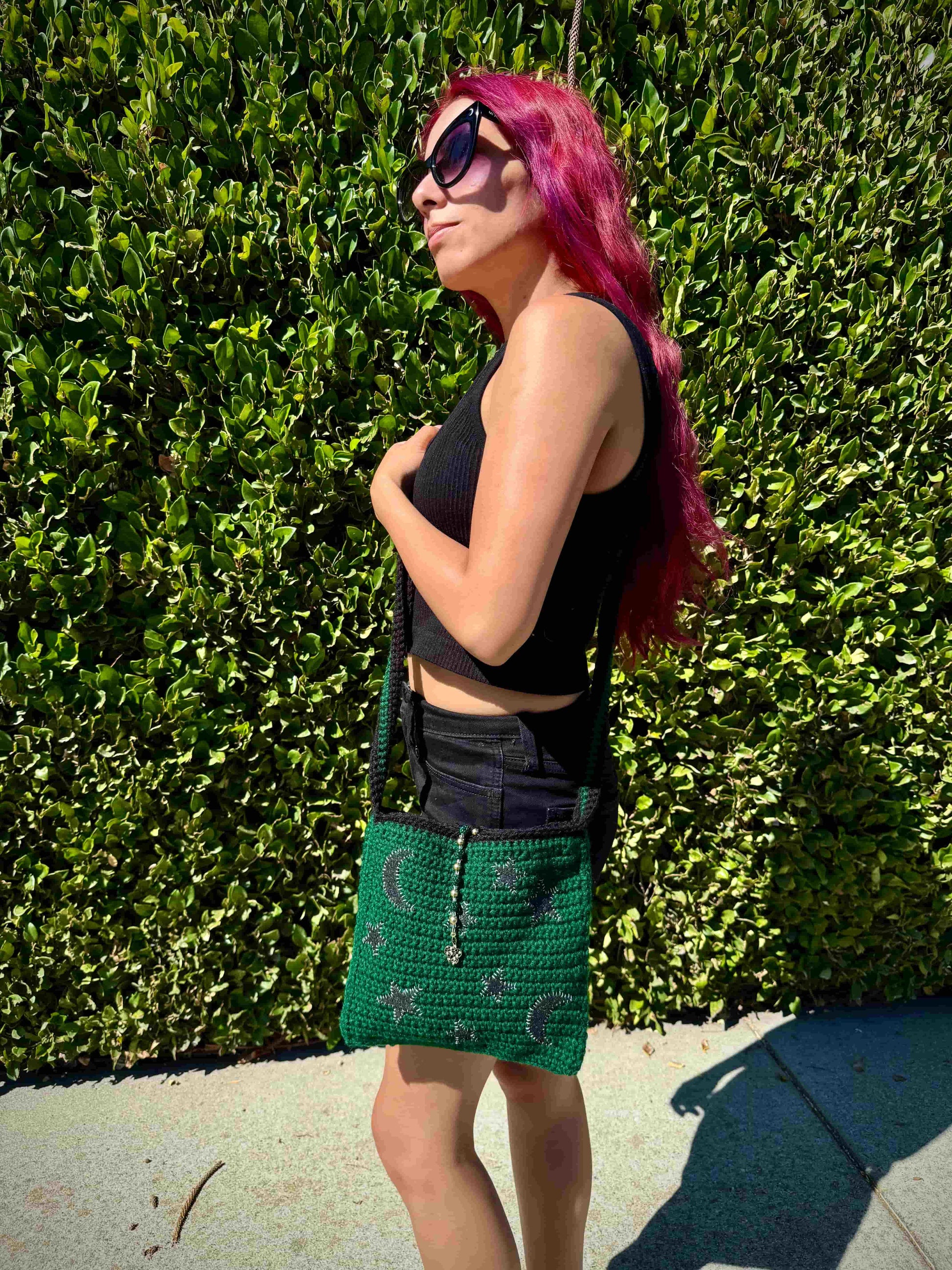 Whimsigoth dark forest and black and celestial bag. Can be worn comfortably on the shoulder or cross-body. Perfect for collecting herbs and carrying spell books on-the-go!