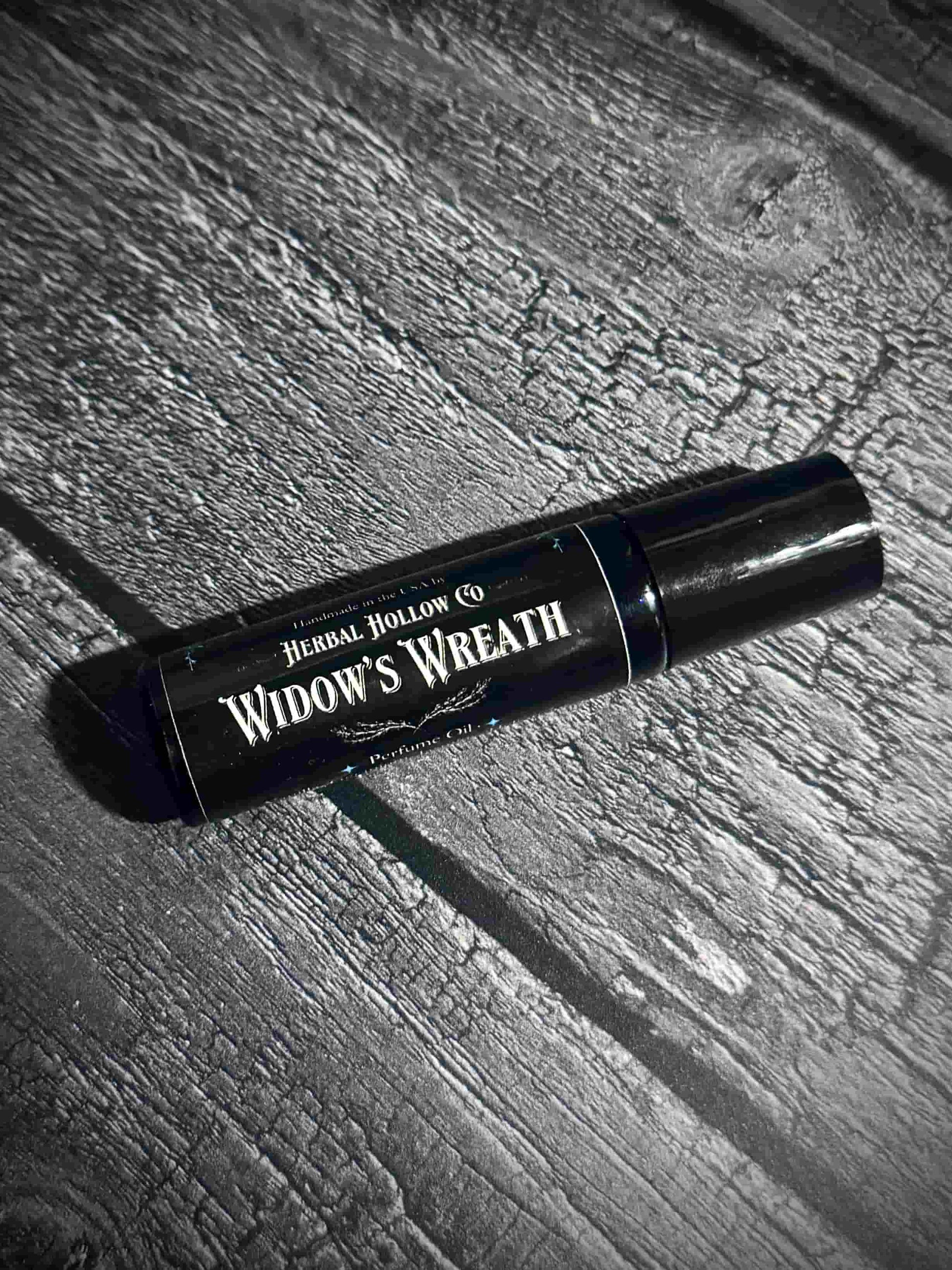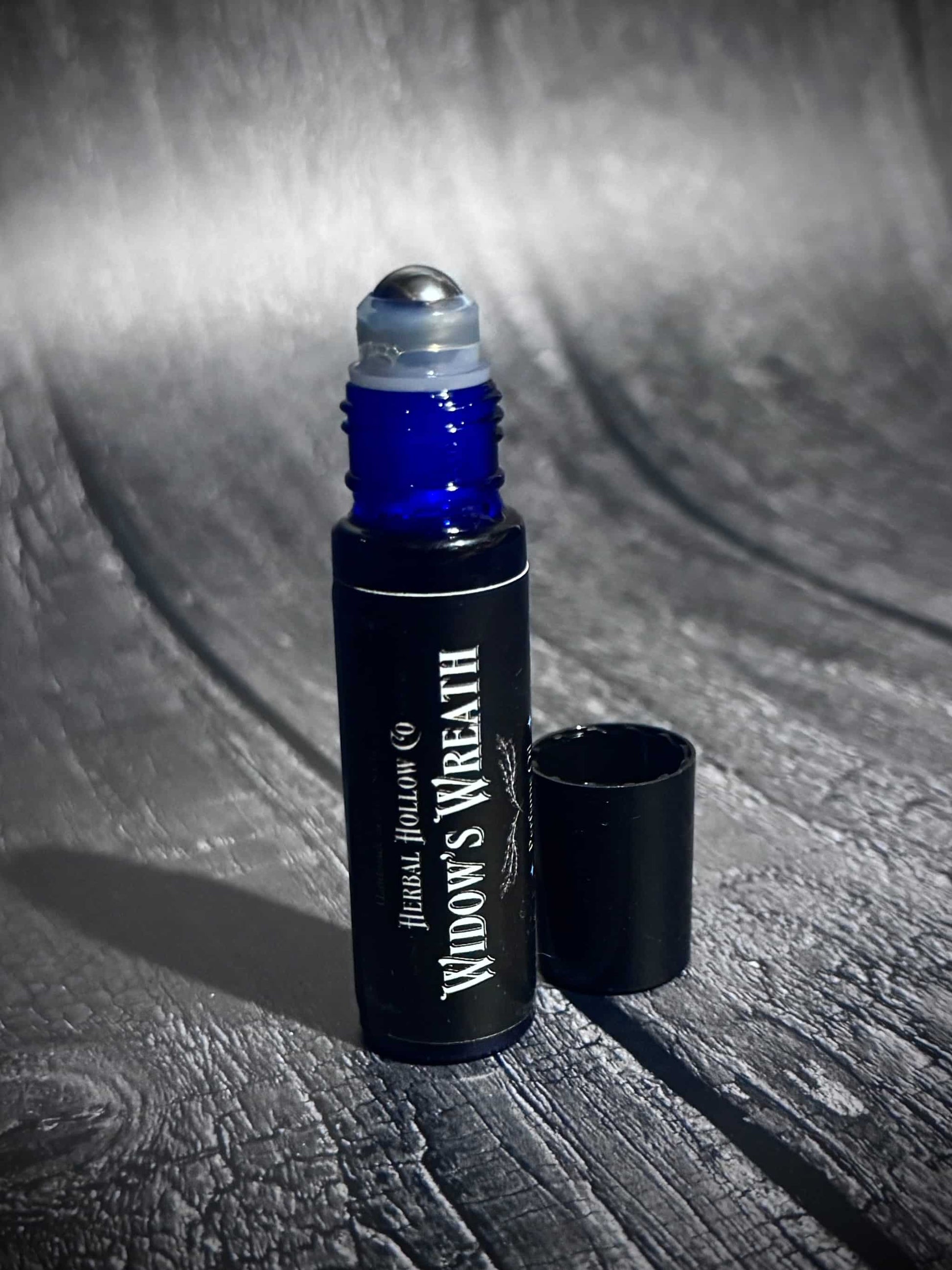 This fantasy-inspired rollerball perfume oil is a haunting floral blend reminiscent of the a sweet grieving widow. A perfect light scent for whimsical, cottage core, elven, or dark feminine aesthetics.